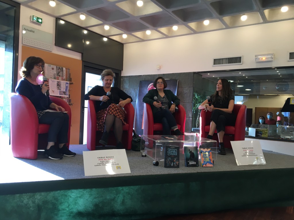 Ensuite, je suis restée au salon pour acheter des livres (mais je prévois un article Book Haul où je vous montre tout ça, et pas seulement les livres achetés là-bas) et pour les faire dédicacer. J’ai finalement assisté à la conférence avec les 3 autrices en lice : Isabelle Pandazopoulos, Camille Monceaux et Aylin Manço. C’était très intéressant, mais j’avoue que je n’ai pas pris de notes donc je ne peux pas trop vous faire de résumé, mais voici une petite photo :